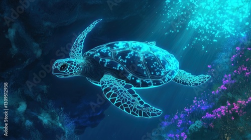 Fototapeta premium Luminous sea turtle gliding seamlessly through a vibrant underwater paradise at night
