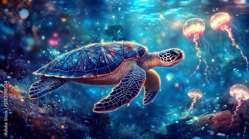 Obraz premium Luminous Sea Turtle swims past bioluminescent jellyfish