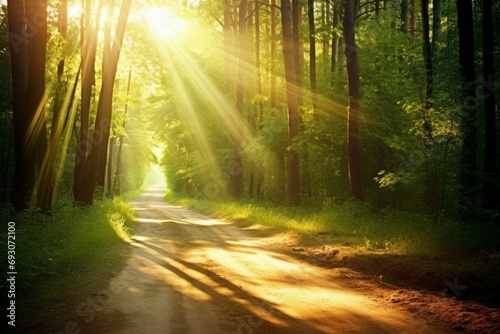 Fototapeta premium Luminous sun rays falling through the green foliage in a beautiful forest, with timber beside a path