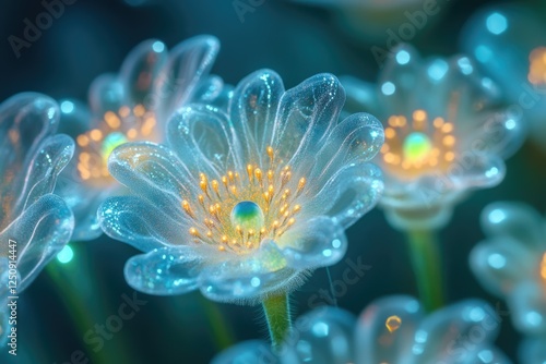 Obraz premium Luminous, translucent flowers with golden centers glow in a dark, ethereal...