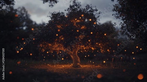 Naklejka premium Luminous Tree with Glowing Spheres in a Dark Outdoors Landscape with Mystical Atmosphere