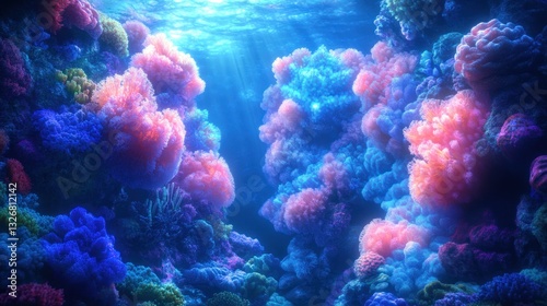 © Cow, Fototapeta premium Luminous underwater garden, a fractal coral reef glowing with vibrant bioluminescence