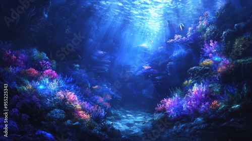 Fototapeta premium Luminous Underwater Kingdom: Digital Painting of Glowing Coral Reefs