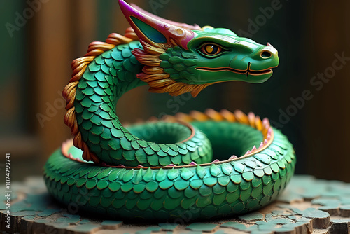 Obraz premium Lunar Chinese Calendar 2025, Close-up of green wooden snake. Carved from wood and painted, intricate details. Symbol of 2025, emphasizing wisdom, flexibility, intelligence and hard work - AI