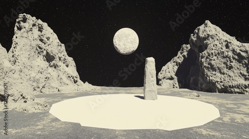 Naklejka premium Lunar obelisk stands on a crater, moonlit night
