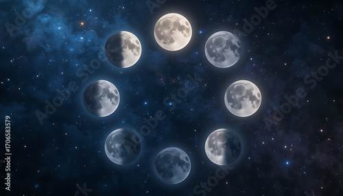 Obraz premium Lunar phases cycle displayed against a starry night sky backdrop.
