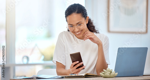 Obraz premium Lunch breaks are for scrolling. Shot of a beautiful woman using a cellphone while working in a modern office.