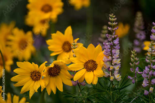 Fototapeta premium lupines and Balsamroot in nature spring time in full color