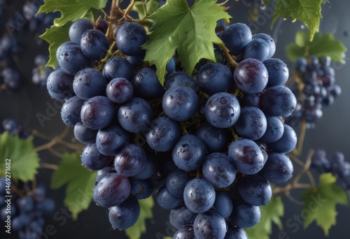 Fototapeta premium Luscious blue grapes, glistening wet, isolated , grapes background, single...