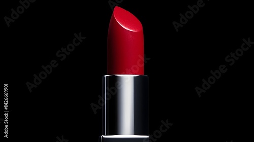 © pkproject, Obraz premium Luscious Red Lipstick Tube Against Sleek Black Backdrop, Glamorous Beauty Product Photography