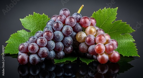 © Roman E, Obraz premium Luscious, ripe red and purple grapes with green leaves on a dark background. Dusted with moisture, the grapes evoke a fresh, juicy harvest. Ideal for wine, viticulture, or healthy eating concepts.