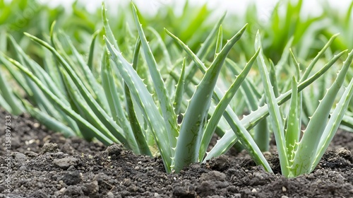 Fototapeta premium Lush Aloe Vera Plants Growing Vibrantly in Fertile Soil Under Natural Light