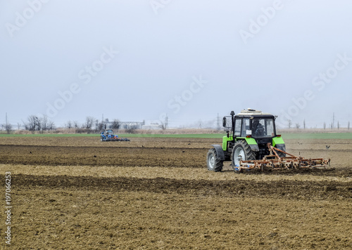 Fototapeta premium Lush and loosen the soil on the field before sowing. The tractor plows a...