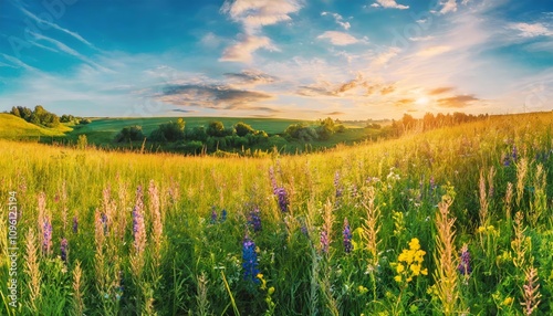 Obraz premium Lush and vibrant summer rustic pastoral landscape panorama with tall...