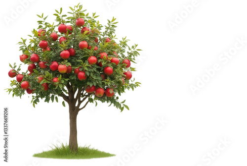 © Dee, Obraz premium Lush apple tree with ripe red apples and vivid green leaves