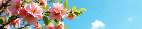 © Bamphen, Obraz premium Lush apricot tree in full bloom against bright blue sky, foliage, spring background