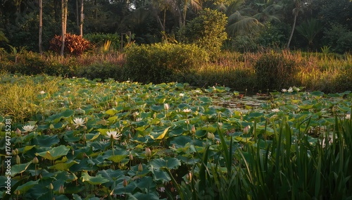 © -Quantum Pixels-, Obraz premium Lush aquatic scenery featuring lotus and water plants in a tropical setting