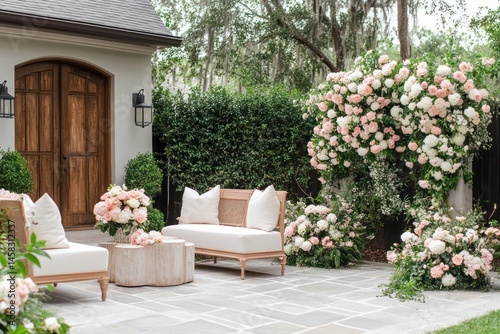 Fototapeta premium lush backyard garden with pastel pink and white floral bunches
