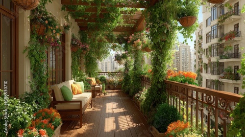 © Vader Stocker, Naklejka premium Lush Balcony Garden with City View