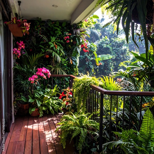 © BAPAK, Obraz premium Lush balcony garden with vibrant flowers and greenery