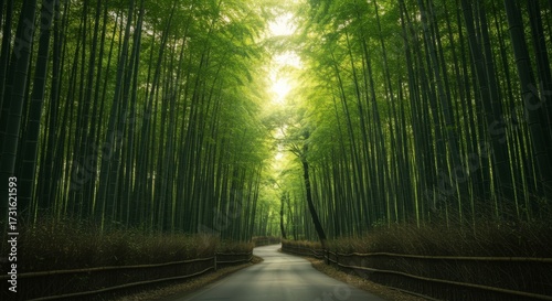 Obraz premium Lush bamboo forest road landscape with sunlight and vertical alignment nature...