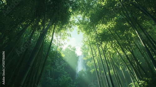 Fototapeta premium Lush bamboo forest with sunlight streaming through trees and a distant waterfall in background