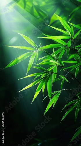 © FoxGrafy, Naklejka premium Lush bamboo leaves illuminated by soft sunlight