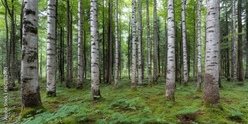 Fototapeta premium Lush Birch Forest with Green Undergrowth Nature Photography
