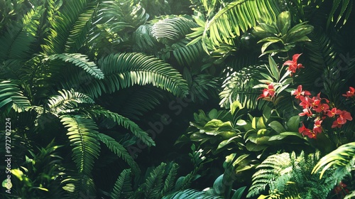 Fototapeta premium Lush botanical garden with vibrant green ferns and exotic flowering plants,...
