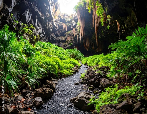 © Riki, Fototapeta premium Lush cave interior with path