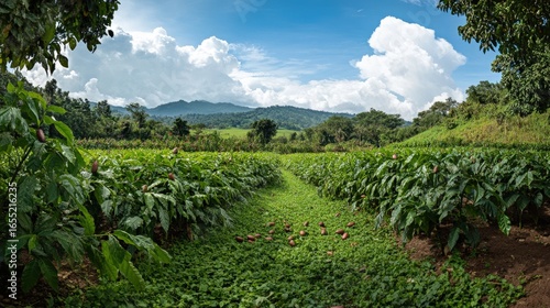 © Mnur, Obraz premium Lush coffee plantation stretches across a valley under a vibrant sky.