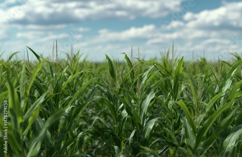 © Dede, Obraz premium Lush cornfield extending under a cloudy sky.