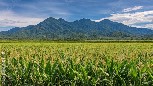 © musthofa, Fototapeta premium Lush cornfield stretches to a distant mountain range.