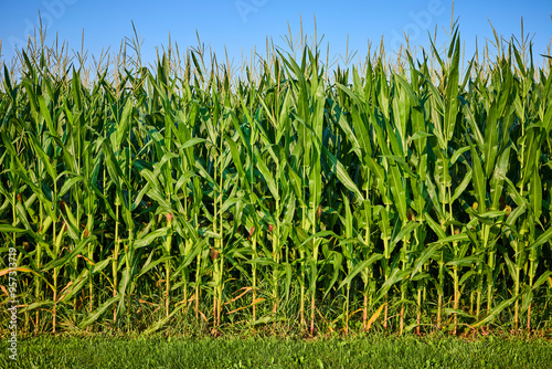 Obraz premium Lush Cornfield with Tall Green Stalks Against Blue Sky at Eye Level