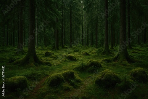 © The 2R Artificiality, Obraz premium Lush dark woodland thriving in the wild