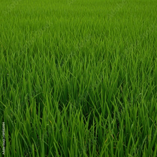 Obraz premium Lush, dense, and vibrant green rice stalks growing densely in a flooded...