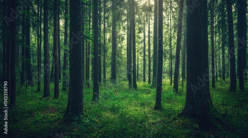 Obraz premium Lush Dense Forest with Sunlight Filtering Through Trees in a Vibrant Natural Environment