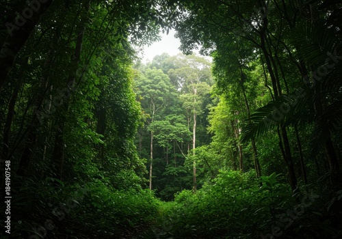 Obraz premium Lush, dense rainforest canopy creating a cool, dark shade beneath vibrant...