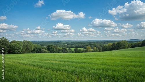 Fototapeta premium Lush emerald fields bordering a forest with a wide sky overhead, capturing...