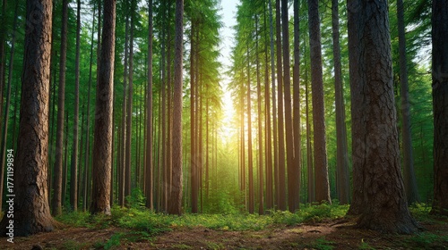 Fototapeta premium Lush Evergreen Forest with Sunlight Breaking Through Trees, Creating a Serene...