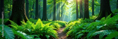 Fototapeta premium Lush fern forest with tall trees and vibrant greenery, foliage, ferns