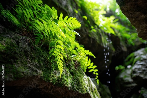 © Alina, Fototapeta premium Lush fern in cave with sunlight
