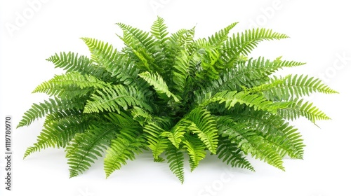 © CreativeBro, Naklejka premium Lush fern leaves ornamental foliage arrangement isolated on white background showcasing vibrant green textures and natural beauty