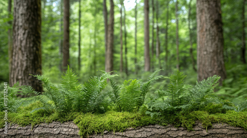Naklejka premium Lush ferns and moss thrive on fallen log in vibrant forest, creating serene...