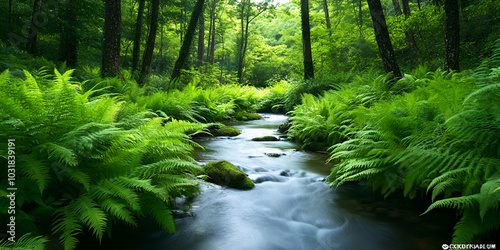 © Ahmad, Obraz premium Lush Ferns Surrounding a Small Waterfall in a Tranquil Garden