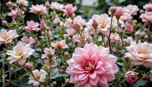 Fototapeta premium Lush Floral Garden Displaying Pink Blossoms and Beautiful Roses Under Natural...