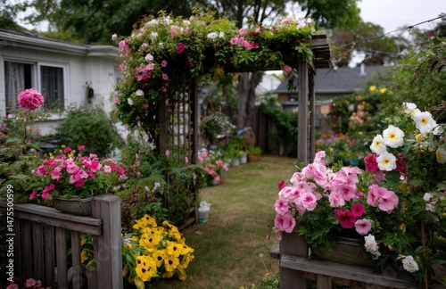 Fototapeta premium Lush flower garden with wooden pergola covered in climbing roses