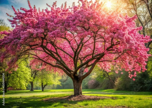 Fototapeta premium Lush foliage surrounds vibrant pink blossoms of majestic tree, showcasing...