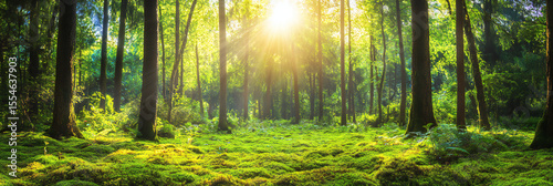 Fototapeta premium Lush Forest Ambiance with Moss-Covered Ground and Dappled Sunlight Filtering...