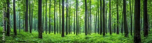 Fototapeta premium Lush forest background with soft sunlight and vibrant green tones